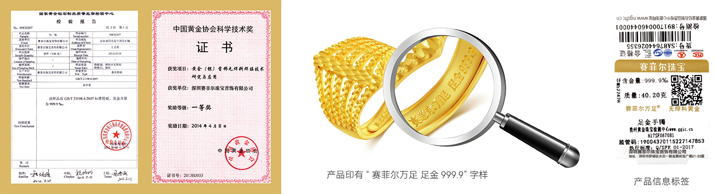赛菲尔——“无焊料黄金”品类开拓者,首创“无焊料焊接技术”,让黄金更纯更有价值,获得国家发明专利,荣获“中国黄金协会科学技术一等奖”,彰显国家权威机构对“赛菲尔无焊料黄金”的高度认可,奠定了“赛菲尔无焊料黄金”的行业领导地位。