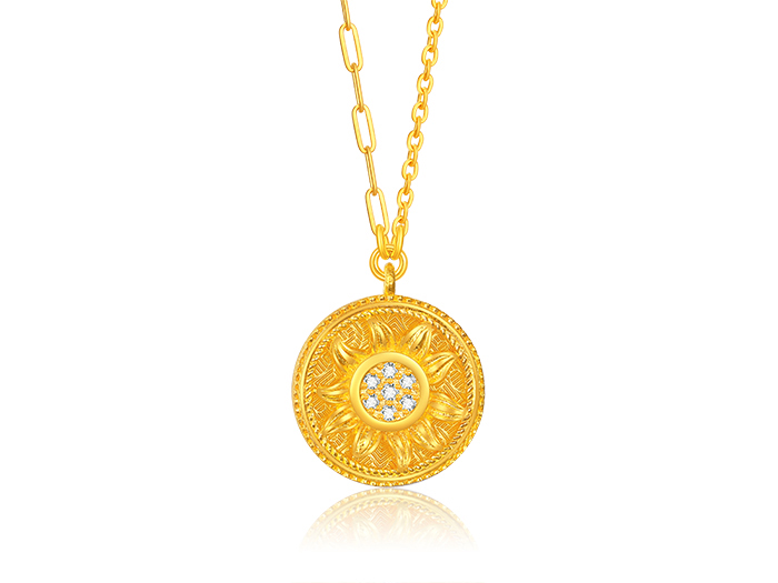 精心镶嵌合成立方氧化锆,采用放射状点钻工艺,象征"永恒追逐的太阳"